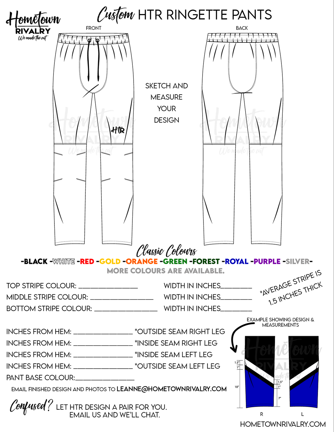 We can create your pant pattern based on the information you send to us. Once your pattern is created, we'll add it to our website and your Association or Team will be ready to order their Custom HTR Ringette Pants.
