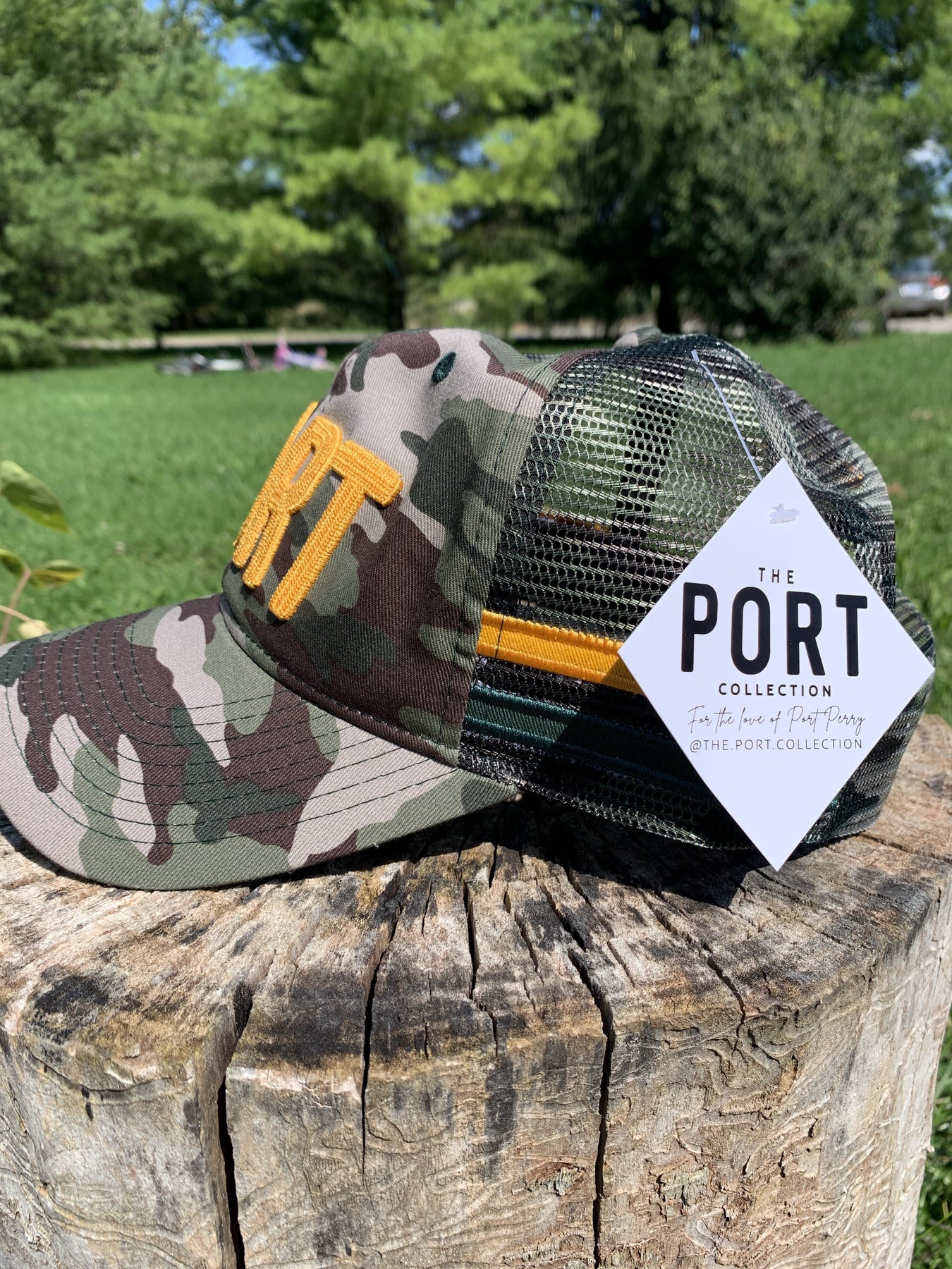 The Retro is a classic, high profile unstructured trucker hat with a vintage feel. Features a Pearl stitch Port logo at front on a two-tone camo body. Flexible lightweight mesh sides and back with cut and sew stripes, curved brim and snapback closure. Back H Logo for Hometown Rivalry.